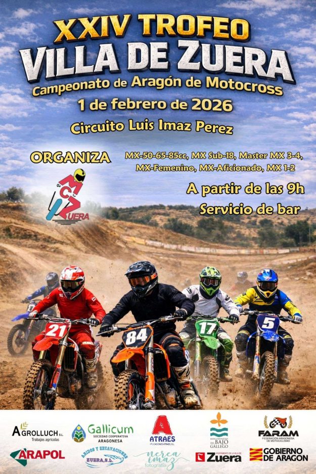 El moto club Zuera organizará el XXIV Motocross Villa de Zuera, en el Circuito de Motocross Luis Imaz. El día 1 de febrero de 2026. Primera prueba puntuable para el Campeonato de Aragón de motocross 2026.