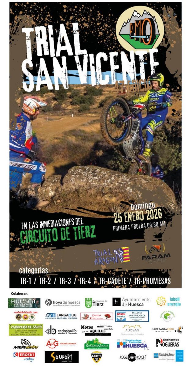 El próximo domingo día 25 de enero, la Peña Motociclista Oscense, en la localidad oscense de Tierz. Organizará el «47º Trial de San Vicente» primera prueba puntuable para el Campeonato de Aragón de Trial 2026.
