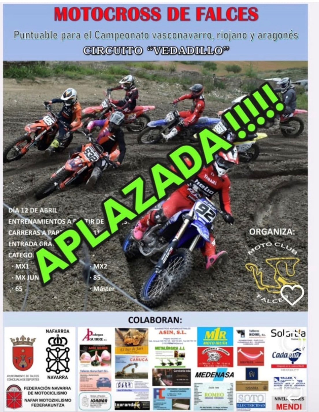 El próximo domingo 26 de abril, la Peña Motociclista Oscense organizará la segunda prueba puntuable para el Campeonato de Aragón y Campeonato Navarro de Motocross de las categorías: MX-1, MX-2, MX Sub-18, MX-Femenino, MX-85cc, MX-65cc, Master- MX3, Master-MX4, MX-Aficionado,