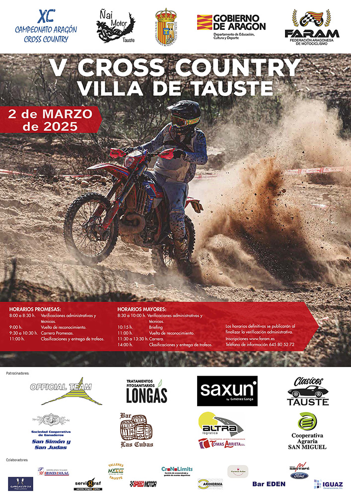 DetallesEl próximo domingo día 2 de marzo, se celebrará la primera carrera puntuable para el Campeonato de Aragón de Cross country 2025, en la localidad de Tauste -Zargoza- Categorías; Senior, Junior, Veterano, Femenino, 125cc, 85cc, 65cc, 50 cc,