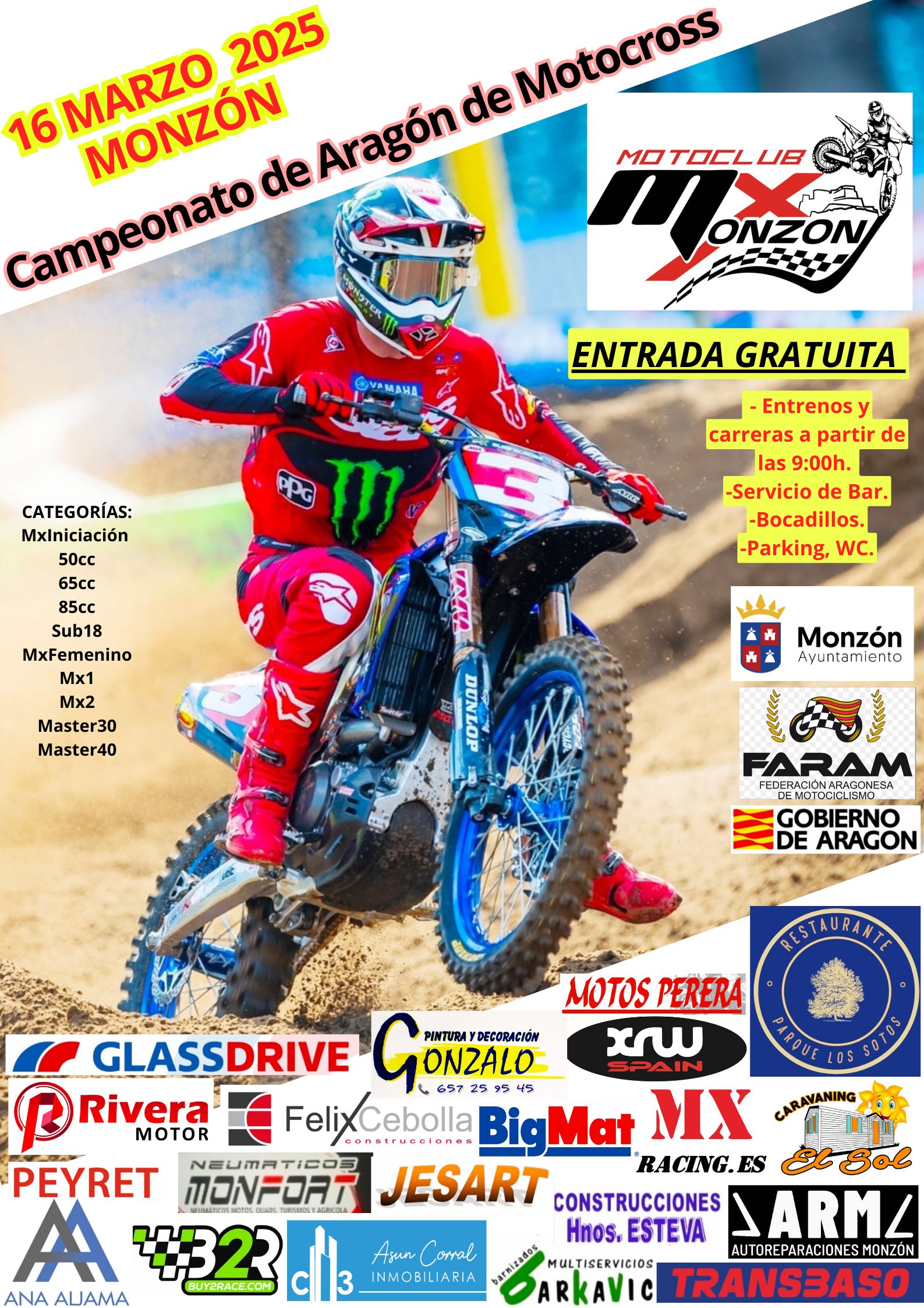 DetallesEl próximo domingo día 16 de marzo, se celebrará la segunda carrera puntuable para el Campeonato de Aragón de motocross 2025, en el Circuito de Monzón, Categorías; MX1, MX2, MX-Sub18, MX-Femenino, Master-MX3, Master-MX4, MX 85cc, MX65cc, MX50 cc, MX Promo-Iniciación