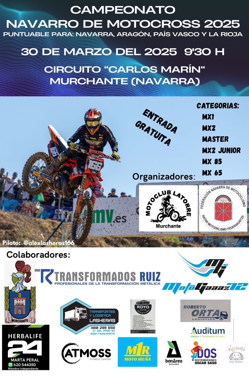 DetallesEl domingo día 30 de marzo se celebrará en el circuito «Carlos Marín» de Murchante -Navarra-. La tercera prueba puntuable para el campeonato de Aragón de Motocross. Categorías: MX1, MX2, MX-Sub18, Master MX, Master MX4, MX 85 cc y MX 65 cc