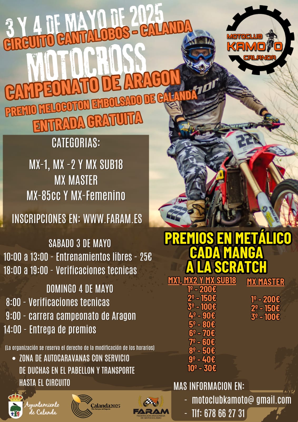 DetallesEl día 4 de mayo en el circuito de motocross Cantalobos de Calanda, se celebrara la 5ª prueba del Campeonato de Aragón de Motocross de las categorías: MX1, MX2, MX-Sub18, Master-MX3, Master-MX4, MX-Femenino y MX85 cc